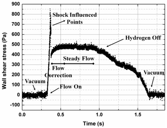 Figure 7 shows the one time trace of the experimental shear-stress data. The variation trend of the curve still remains fairly similar to that of the wall pressure at the sensor nearby. At the beginning, under no flow condition, the fence sensor remained at zero output. When the vitiated air started the tunnel, the wall shear stress suddenly increased. At this moment, a few data points were recorded that are apparently “outliers” due to shock or complex flow interaction. Subsequently, flow correction occurred over a range from ~0.4 to 0.6 s. At this stage, the wall shear values gradually increased and then leveled off. The duration of the steady flow condition was about 0.4 s, and the supplied hydrogen was then exhausted, as demonstrated by the slow drop in the wall-shear-stress experimental data.