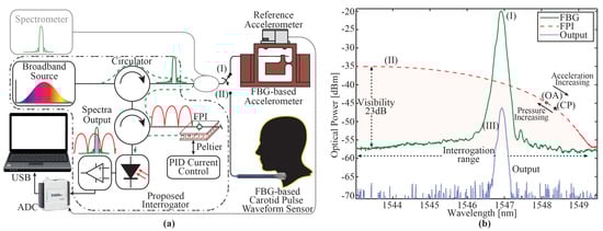 - Roncancio, J.S.; González, N.; Cano, C.C.; Varón, M. Low cost optical interrogation system based on FBG sensors. In Proceedings of the 2015 SBMO/IEEE MTT-S International Microwave and Optoelectronics Conference (IMOC), Porto de Galinhas, Brazil, 3–6 November 2015; pp. 1–5. [Google Scholar]