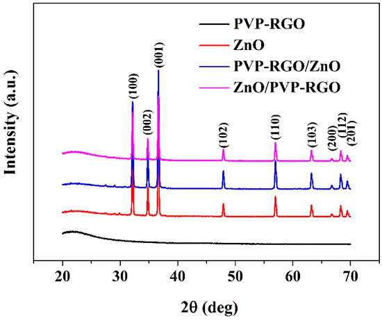 Typical XRD images of polyvinyl pyrrolidone–reduced graphene oxide (PVP-RGO), zinc oxide (ZnO), PVP-RGO/ZnO and ZnO/PVP-RGO films.