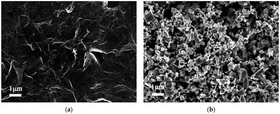 Figure 2 shows XRD patterns of PVP-RGO, ZnO, PVP-RGO/ZnO, and ZnO/PVP-RGO films. In ZnO, PVP-RGO/ZnO, and ZnO/PVP-RGO curves, all diffraction peaks can be indexed to the hexagonal wurtzite structure of ZnO. The intensity of the (101) peak is stronger than the (100) and (002) peaks in all of these samples [37,38]. Moreover, the broad peak from 20 to 33° in the curve of PVP-RGO reveals the presence of graphene sheets in the nanocomposities [39]. The typical SEM images of as-prepared PVP-RGO, ZnO, PVP-RGO/ZnO, and ZnO/PVP-RGO films are shown in Figure 3a–d, respectively. The PVP-RGO film in Figure 3a has obvious wrinkles and exhibits a continuous distribution. However, the ZnO nanopowders in Figure 3b are scattered throughout the substrate, forming a network of pores. These pores are expected to provide water moisture adsorption sites [24]. Each ZnO grain is a polyhedron with facets, edges, and vertices, indicating their polycrystalline structures [20]. Pure ZnO nanopowders with lengths in the range of approximately 0.1–1 μm and diameters in the range of 50–500 nm are observed. The length of most ZnO nanopowders is larger than 500 nm. In the case of PVP-RGO/ZnO film, part of the PVP-RGO film is covered by ZnO nanopowders and the others are exposed to air (see Figure 3c). In the case of the ZnO/PVP-RGO films, the PVP-RGO nanocomposites scattered throughout the ZnO substrate form a network structure. This connected multilayer structure contributes to the electron transfer between ZnO nanopowders and PVP-RGO nanocomposites, and it increases the surface area of the sensing film to improve the sensor’s sensitivity (see Figure 3d) [28].