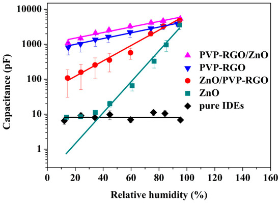 The humidity responses of ZnO, PVP-RGO, ZnO/PVP-RGO, and PVP-RGO/ZnO sensors and pure IDEs were measured for comparison. The response curves of all sensors and IDEs are as shown in Figure 4. As we can see, the pure IDEs were insensitive to humidity, while the measured capacitances, for all sensors, increased monotonically with the increase of RH and, except for the ZnO sensors at low RH (<40%), showed nearly linear responses in the logarithmic scale. Hence, the sensitivity was defined as the ratio of the logarithmic capacitance difference to the RH change (Δlog10C/ΔRH). Obviously, the sensitivity of the ZnO/PVP-RGO (~0.022) sensors was about three times larger than that of PVP-RGO (~0.008) and PVP-RGO/ZnO (~0.008) sensors in the RH range 15–95%. ZnO sensors exhibited the highest sensitivity (~0.044) at middle and high RH (>40%), while it was insensitive at low RH. One possible explanation for this is that the size of the ZnO nanopowders was relatively large, which meant that the ZnO film had a low surface area and exhibited a low affinity to external water molecules at a low RH range [40]. However, the PVP-RGO film had certain hydrophilic functional groups and exhibited a relatively high affinity for external water molecules; thus, PVP-RGO, PVP-RGO, and ZnO/PVP-RGO sensors showed better sensitivity at low RH. Overall, considering the high sensitivity and the good linearity, the ZnO/PVP-RGO sensors exhibited the best sensing performance, which mainly came from its special surface morphology and microstructures.