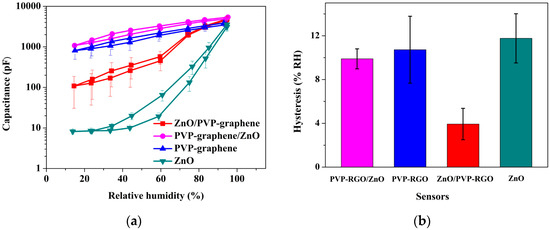 It is well known that the humidity hysteresis in the absorption/desorption process will cause uncertainty when determining the RH value. Therefore, humidity hysteresis had to be as small as possible for practical use. Here, the hysteresis characteristics of ZnO, PVP-RGO, ZnO/PVP-RGO, and PVP-RGO/ZnO sensors are depicted in Figure 5a, and Figure 5b shows their statistical analyses. It is worth mentioning that the ZnO/PVP-RGO sensors had much smaller hysteresis (~3.9% RH) than the sensors based on PVP-RGO/ZnO (~9.9% RH), PVP-RGO (~10.7% RH), and ZnO (~11.8% RH). In our experiment, only the prepared ZnO/PVP-RGO sensors showed an acceptable hysteresis value less than 5% RH. A narrow hysteresis loop of ZnO/PVP-RGO sensors indicates that fast equilibrium can be achieved between the adsorption and desorption processes in the ZnO/PVP-RGO films.