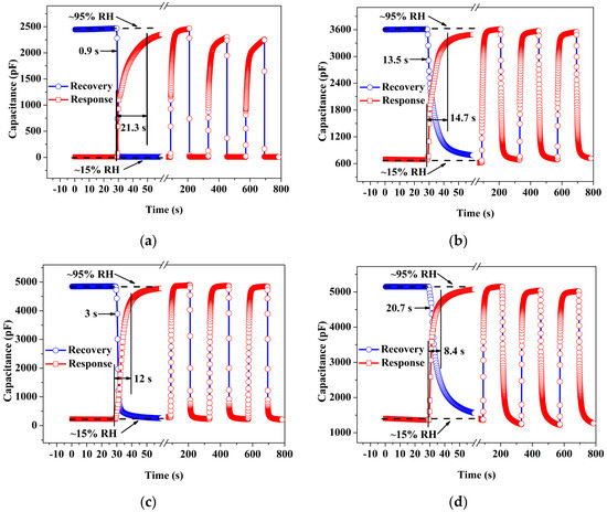 Traditionally, the basic mechanism for capacitive-type humidity sensors is electrical permittivity that is sensitive to humidity variation, and the electrical response that occurs in a humidity sensor is linked to the water adsorption–desorption process that takes place on the exposed surface of the sensing material [30]. Water condensation tends to occur within the porous structure of the sensing materials. Since water has very high permittivity at room temperature (~80) compared to air, the effective dielectric constant of the whole sensing material will change in response to water adsorption or desorption [43].