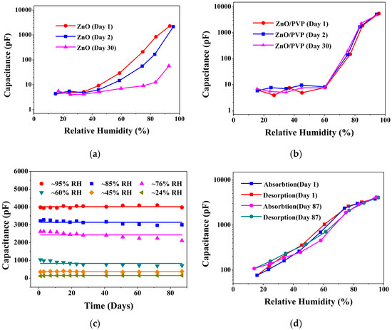 Capacitance vs. RH for (a) ZnO and (b) ZnO/PVP sensors in one month. (c) Stability of the ZnO/PVP-RGO sensor under various RH conditions. (d) Capacitance vs. RH for ZnO/PVP-RGO sensor, showing good stability and little hysteresis over 87 days.