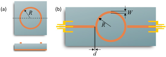 Figure 1. Microstrip ring resonators: (a) basic setup and (b) transmission-type ring resonator with two capacitively coupled feed lines for excitation.