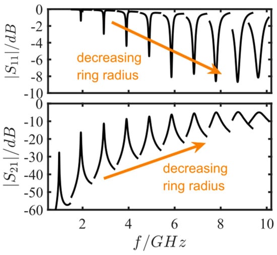 Typical planar resonance structures with microstrips are ribbon resonators, disk resonators, or ring resonators [31]. Owing to their geometry, standing waves form. They are trapped between the boundary conditions of the designed microstrips. Microstrip resonators must be coupled with one or two feed lines for excitation. Two types of information can be obtained: the reflection parameters S11, where only one coupled feed line is required; and the reflection/transmission type. Here, two feed lines are used, allowing evaluation of the reflection parameter S11 as well as the transmission parameter S21 [31].