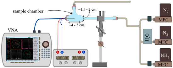 The experimental setup included a glass sample chamber containing the microwave transducer, a vector network analyzer (VNA: Anritsu MS2820B), a data acquisition system (Laptop), and a gas supply unit connected to the sample chamber. The latter consisted of three mass flow controllers to control the flows of N2, NH3, and the water-saturated N2. The total gas flow rate was set to 0.5 mL/min. The network analyzer with connected coaxial cables was calibrated using a SOLT calibration kit (Anritsu SMA Calibration Kit 3650). The setup is depicted in Figure 6.