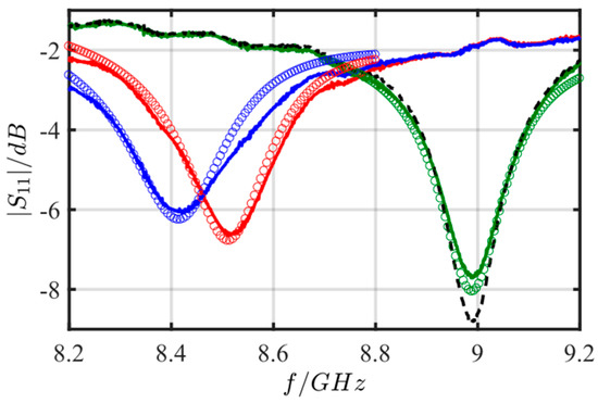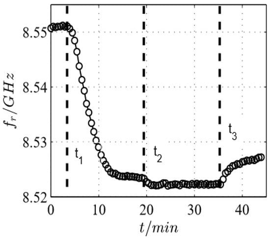 As the sensor response, the reflection parameter S11 was used. The complex reflection parameter S11 was measured in a frequency range from 8 GHz to 10 GHz every 10 to 20 seconds. Then, before the resonant frequency and the absolute value of the reflection coefficient (|S11|) were determined, the reflection spectrum around the operating resonant frequency was filtered using a Lorentz fit to remove noise and parasitic reflections.