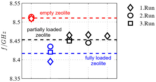 Figure 8. Initial tests: resonant frequencies of the microwave sensor for the three experimental runs with different loading conditions of the zeolite: empty, partly loaded, und fully loaded (for further details see text).