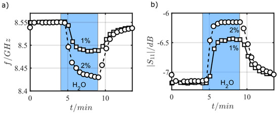 Then, the influence of defined water content was investigated. Figure 10 is a time-dependent plot of fres and |S11|@fres for an admixture of 1 vol % and 2 vol % of water into nitrogen. One can clearly see that the device responds to water. This excludes O2 or CO2 (both from air) from being responsible for the sensor effect in Figure 9. Again, adsorbed water can be desorbed in water-free nitrogen even at room temperature, but the process requires a longer time. Here, higher temperatures would be favorable.