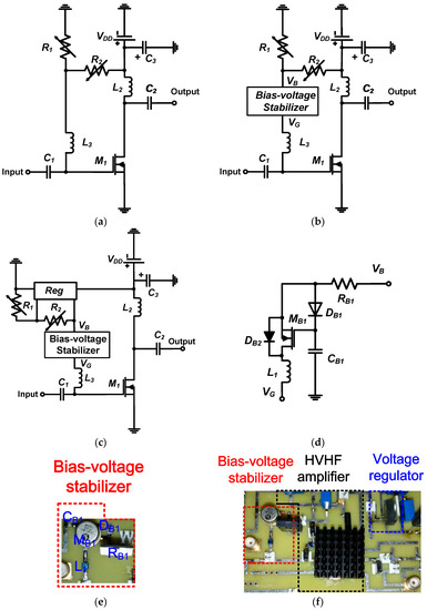 Architectures of (a) the high-voltage–high-frequency (HVHF) amplifier; (b) the HVHF amplifier with the bias-voltage stabilizer; (c) the HVHF amplifier with the bias-voltage stabilizer and a voltage regulator; and (d) the bias-voltage stabilizer. Implementation of (e) the bias-voltage stabilizer; and (f) an HVHF amplifier with the bias-voltage stabilizer and a voltage regulator.