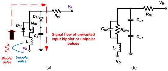 Thus, the bias-voltage stabilizer designed is expected to block unwanted input pulses in the frequency range defined in (1). As shown in Figure 2a, we selected an HV transistor (MB1) with relatively low parasitic capacitances (Cgd, Cgs, and Cds = 7 pF, 28 pF, and 18 pF, respectively) because the DC voltage from the resistor divider turns on the transistor (MB1), and bipolar or unipolar pulses from the input port can subsequently pass through the diodes (DB2 and DB1) and the capacitor (CB1) to ground.