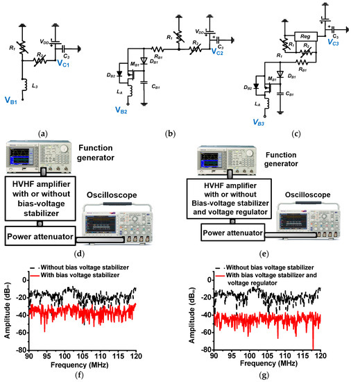 Illustration of the flow of unwanted input pulses through the bias-voltage stabilizer, and measured radio frequency (RF) spectrum data of leakage voltage. Schematics of the (a) resistor-divider circuit; (b) the resistor divider with a bias-voltage stabilizer; and (c) the resistor divider with a bias-voltage stabilizer and voltage regulator; Setup for measuring the leakage voltage of (d) the HVHF amplifier with a bias-voltage stabilizer; and (e) the HVHF amplifier with a bias-voltage stabilizer and voltage regulator; Measured leakage voltage spectra at the output port (f) with and without a bias-voltage stabilizer; and (g) with and without a bias-voltage stabilizer and voltage regulator.