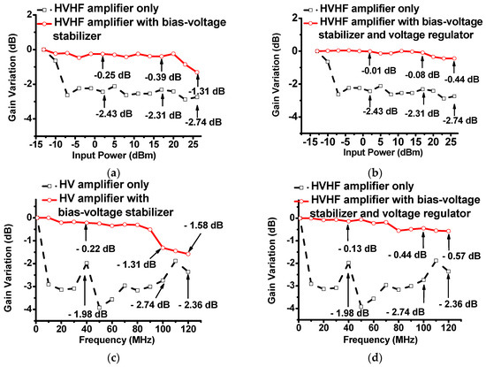 (a) Plots of the measured voltage gain deviation vs. input power of the HVHF amplifier alone, and the amplifier with a bias-voltage stabilizer; (b) Plots of the measured voltage gain deviation vs. input power of the HVHF amplifier alone, and the amplifier with a bias-voltage stabilizer and voltage regulator; (c) Plots of the measured gain deviation vs. frequency of the HVHF amplifier alone, and the HVHF amplifier with a bias-voltage stabilizer; (d) Plots of the measured voltage gain deviation vs. frequency of the HVHF amplifier alone, and the HVHF amplifier with the bias-voltage stabilizer and voltage regulator with an input power of 26 dBm.