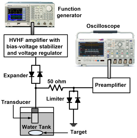 Table 1 summarizes the measured performances of the HVHF amplifier, HVHF amplifier with bias-voltage stabilizer, and HVHF amplifier with bias-voltage stabilizer and voltage regulator. To verify the feasibility of deploying the bias-voltage stabilizer circuit in VHF ultrasound transducer applications, we implemented a typical pulse-echo measurement system, as shown in Figure 5. This system is typically used to evaluate the operation of ultrasound transducers or electronic devices developed for ultrasound applications [26,27]. Five cycles of sinusoidal bipolar pulses, generated by a function generator (AFG3252), were transmitted through the proposed HVHF amplifier, the amplifier with the bias-voltage stabilizer, and the amplifier with the bias-voltage stabilizer and a voltage regulator, to trigger a focused immersion transducer through a diode-based expander (a cross-coupled diode, P1N4148, Diodes Incorporated, Plano, TX, USA). The ultrasound transducer detected the echo signals from the target. The received echo signals were then transmitted through a diode-based limiter (a 50-Ω shunt resistor with a cross-coupled diode) with a preamplifier (AU-1114, MITEQ Inc., Hauppauge, NY, USA). Waveforms of the echo signals were displayed on a 1-GHz 5-GS/s sampling oscilloscope (MSOX4154A, Keysight Technology). Subsequently, the spectral data from the echo signals was processed using a MATLAB program (MathWorks Inc., Natick, MA, USA) on a personal computer.