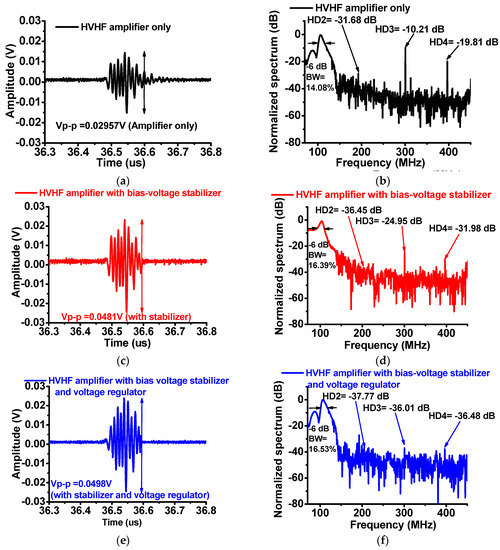 Figure 6 shows a comparison of the waveforms of the echo signals and the spectra generated by the immersion transducer triggered using the HVHF amplifier alone, the amplifier with the bias-voltage stabilizer, and the HVHF amplifier with the bias-voltage stabilizer and a regulator. Figure 6a,c,e show that the measured amplitudes of the echo signals from the HVHF amplifier with the bias-voltage stabilizer (0.0481 Vp-p) and the amplifier with the bias-voltage stabilizer and regulator (0.0498 Vp-p) are higher than that of the HVHF amplifier alone (0.0296 Vp-p). Figure 6b,d,f show that the second, third, and fourth harmonic-distortion components (HD2 = −36.45 dB, HD3 = −24.95 dB, and HD4 = −31.98 dB) of the signals generated by the HVHF amplifier with the bias-voltage stabilizer, and the second, third, and fourth harmonic-distortion components (HD2 = −37.77 dB, HD3 = −36.01 dB, and HD4 = −36.48 dB) of the signals generated by the amplifier with the bias-voltage stabilizer and voltage regulator were lower than those of the signals generated by the HVHF amplifier alone (HD2 = −31.68 dB, HD3 = −10.21 dB, and HD4 = −19.81 dB). The −6-dB bandwidths (BWs) of the echo signals of the HVHF amplifier alone, the HVHF amplifier with the bias-voltage stabilizer, and the HVHF amplifier with a voltage-regulator and bias-voltage stabilizer are 14.08%, 16.39%, and 16.53%, respectively. The total harmonic distortions of the echo signals calculated for situations when the transducer is triggered by the HVHF amplifier alone, the amplifier with the bias-voltage stabilizer, and with the bias-voltage stabilizer and a voltage regulator, were −19.46 dB, −47.83 dB, and −63.84 dB, respectively. These results thus demonstrate that HVHF amplifiers with a bias-voltage stabilizer, or with a bias-voltage stabilizer and a voltage regulator, may be useful in improving the amplitudes of echo signals and reducing the harmonic distortions of the echo signals from the VHF ultrasound transducers used in pulse-echo measurement systems.