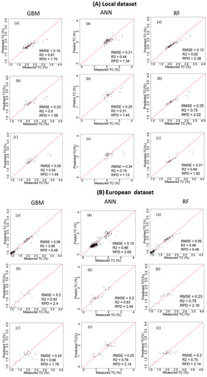 In this work we compared the accuracy of the GBM, ANN and RF methods for the prediction of TN and TC based on local and European datasets. The variations of R2, RPD as well as RMSE values obtained from cross-validation, laboratory and on-line prediction are shown in Table 2 and Figure 8 and Figure 9.