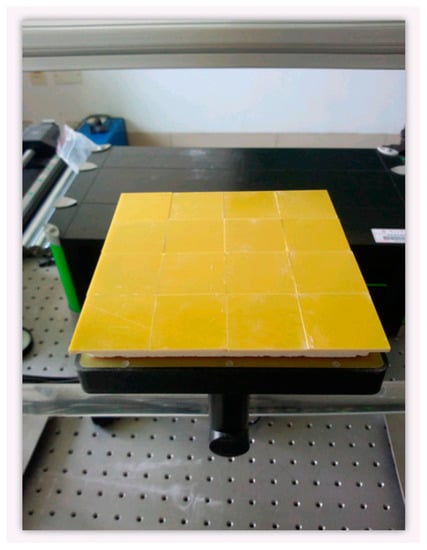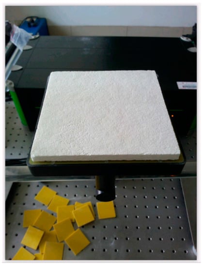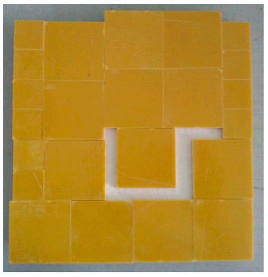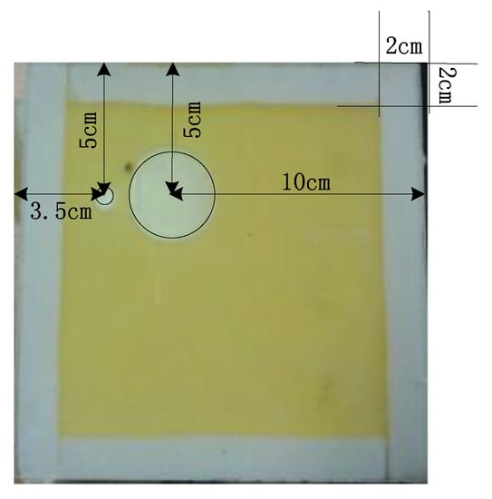The experimental cases are as follows: 18 × 18 cm2 materials of porous ceramic are used for the experiments. The glue line is 16 × 16 cm2 epoxy resin, and the adhesive thickness is 3 mm. The full yard (full adhesive) and the empty yard (full air) are shown in Figure 2 and Figure 3.