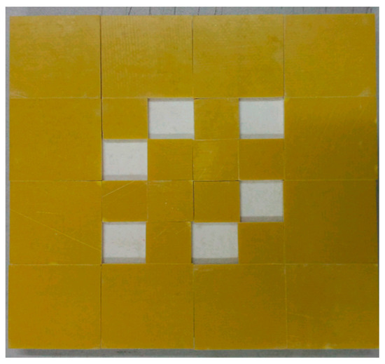We use a 16 × 16 cm2 epoxy resin in this experiment. To simulate the traditional defects of cementing structure such as the bubbles and lacks of plastic induced by pressing, here we consider the Sample 1 with six pieces of 2 × 2 cm2 square holes as the defect, as shown in Figure 4.