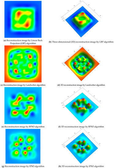 LBP, Landweber, BPSO, and the proposed IPSO algorithms are applied for the defect detection of Sample 2. The experimental results are shown in Figure 7. It can be seen from Figure 7 that when compared with Figure 7a–f using LBP, Landweber and BPSO algorithms, the performance of reconstructed images Figure 7g,h, using the proposed IPSO are significantly improved and more detailed information of defects, such as the size, shape, edge, etc. are displayed clearly, which demonstrates the effectiveness and superiority of the proposed algorithm.