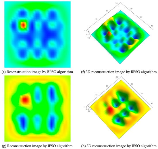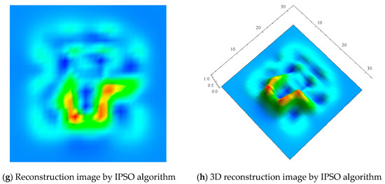 It is worth pointing out that, seen from Figure 5g,h, the proposed IPSO algorithm in the paper shows the significant advantages to the defect location, size, in addition, contour information of the defect can be more clearly reconstructed by the proposed IPSO algorithm. It is obvious that the defect location, size, and contour information of the defect can be more clearly reconstructed by the proposed IPSO algorithm than the other three algorithms.