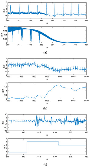 Currently, the interest in monitoring patients over several days is growing because of its potential to find anomalies that remain undetected in standard ECG and 24 h Holter. This kind of register is referred to as long-term monitoring (LTM) recordings, and these have been found to be useful for the detection of subclinical atrial fibrillation in patients with cryptogenic stroke [7,8], for the detection of non-sustained atrial or ventricular arrhythmias in patients with heart failure [9], and for the assessment of autonomic parameters obtained from heart rate variability analysis [10]. Holter ECG is obtained from portable devices while patients continue with their daily activities; thereafter, the signal is highly affected by noise and artifacts. Thus, as a result of the extensive use of Holter ECG, noise has become a matter of major concern, particularly in LTM recordings, because its presence may result in wrong diagnoses.