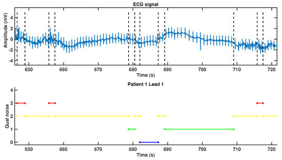 Noise map representation (bottom) of the clinical severity of noise observed in a 75 s electrocardiogram (ECG; top). Horizontal lines extend during the time periods for which each segment has been labeled by an expert. There are noise-free segments in blue (type 0) and segments in green, where the P and T waves, as well as the QRS complexes, are readable (type 1). In yellow segments, only the QRS complexes can be reliably identified (type 2), whereas segments with hardly recognizable QRS complexes, in red (type 3), are those for which no clinical parameter can be trustfully measured because of severe noise.