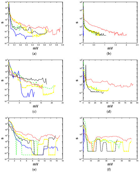 Estimated distributions (from scaled log-histograms) for the different noise types in external event recorder (EER) (a,c,e) and 7 day Holter (b,d,f) recordings. Noise samples (in duration, seconds, as multiplied times the sampling period) are represented in terms of the noise with the same voltage level (in mV). The color code is similar to that for the noise maps: noise-free segments—blue; low-noise—dashed, green; moderate-noise—crosses, yellow; hard-noise—dotted, red; and other noises—dash–dot, black. Axis represent number of samples scaled to their time duration (vertical, in s) vs. amplitude (horizontal, in mV).
