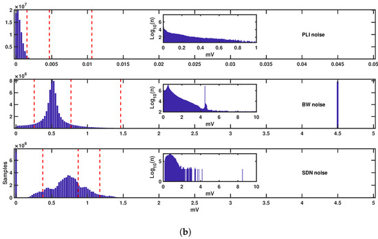 The threshold divisions, as well as the histograms of each kind of noise, are shown in Figure 4. In order to set the threshold values, only the EER histograms were used, because these provided us with a wider view of the noise, as the records came from different patients and covered very different situations related to noise. We note that the horizontal axis has a much lower magnitude in the PLI noise, as far as that its amplitude is in general much lesser than that of BW and SDN noise. However, in all of these, the distributions are shown to be mostly exponential-like (PLI and BW noise) and with heavy tails, although SDN is slightly different and centered. The thresholds were chosen on the histogram regions, aiming to separate the low-amplitude region (close to zero amplitude), the heavy-tail region (large amplitude values), and different trends in the distribution mass morphology to separate low from medium regions.