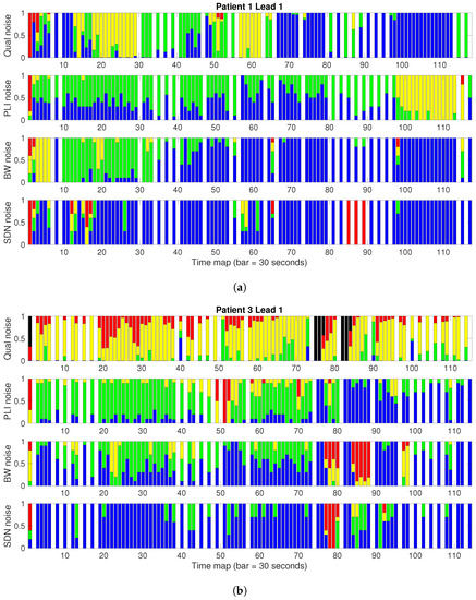 To our best knowledge, the concept of noise maps with noise severity criteria has never been raised. In the scarcity of published evidence to support noise clinical severity descriptions, methods are mainly designed with the purpose of testing the denoising algorithms proposed by their authors. For example, the MIT-BIH Arrhythmia database was used in [27] to train a support vector machine classifier to perform quality classification of clean ECG signals with added noise of three different kinds, namely, muscle artifacts, BW interference, and electrode motion, with different SNR levels. Similarly to our work, they identified four types of quality level noise (minor, moderate, severe, and extreme). In [44], the cardiologists manually re-annotated the quality of 1500 10-s recordings and 25 60-min recordings, and they identified three types of noise from an energy point of view, namely, low-, medium-, and high-energy noise. In [40], six noise corruption levels were established, from no-noise to noise-positive detection, according to ECG amplitudes and slopes in different frequency bands). In [45], the authors described a mathematical algorithm for noise level estimation based on thresholds and comparison with R-waves. None of these studies scrutinized the statistical and temporal distribution of a clinically established gold standard for the noise severity.