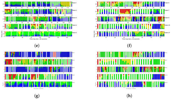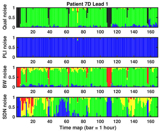 The visualization of noise maps in long recordings can be operatively limited; hence, we also introduced the use of noise bars, as seen in the example in Figure 5. Noise bars were obtained by aggregating the durations of the same types of noise in fixed-duration segments, known as time bars, and then normalizing these in each time bar. We note that the time bar was 30 s in length for EER patients. Thus, a vertical bar stands for one single time segment, which shows the ratio of each kind of noise present throughout that time period. The same color code is used so that the lower (upper) part of the bar conveys the lower (harder) noise levels. This provides a profile view, giving a good idea of how clean or noisy a recording is and how many and which clinical parameters are possible to measure through it. Different time segments are separated by a blank bar for the case of EER when stored segments are not continuous in time.