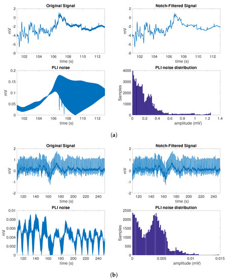 Additional considerations of the estimated powerline interference (PLI) noise: (a) example of external event recorder (EER) segment with high presence of PLI noise; (b) example of EER segment with all kinds of quantitative noise.
