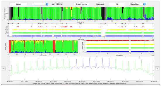 Finally, Figure 9 shows the front-end of our proposed noise maps when used with the 7 day Holter. The first panel shows the noise bars for the entire Holter, and the segments of different severity according to the gold standard are shown in the second panel. A high presence of low noise in more than 80% of the recording (in green) allows to measure all the clinical measurements, both in morphology and rhythm. The third row with two plots shows noise bars and their corresponding noise maps to measure the amount of BW, PLI or SDN components, so that qualitative versus quantitative comparisons can be performed to show the significance of the ECG clinical distortion. The lower panel shows the color-labeled ECG segment, which can be navigated on the second row and adjusted in time length.