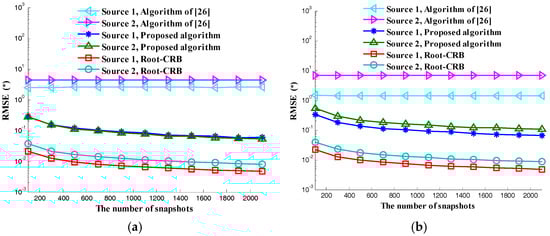 In the third simulation, we compare the RMSE versus the number of snapshots. The number of snapshots is set to vary from 100 to 2100. Other simulation parameters are the same as those of the second simulation. The result is shown in Figure 7. We can see that the C-SPD ESPRIT-like algorithm is getting better and better with the increase of snapshots. There is a gap between the proposed C-SPD ESPRIT-like algorithm and CRB. The reason is same as in the analysis of the second simulation. The performance of the algorithm in [26] is poor no matter how much the snapshots increases.