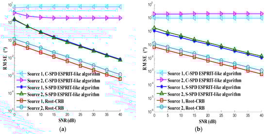 In the fourth simulation, we test the estimation accuracy of the S-SPD ESPRIT-like algorithm with separated EMVSs under the condition of GPU and MC. The contrast experiment is the C-SPD ESPRIT-like algorithm with centralized EMVSs under the condition of GPU and MC. The elements of separated EMVSs are set to far enough apart to avoid the MC and the structure is based on the rule we proposed in Equation (45). The mutual coupling matrix of collocated EMVSs is set as a Toeplitz matrix. Other simulation parameters are the same as those of the second simulation. The SNR varies from 0 dB to 40 dB. Two hundred simulations are conducted under each SNR. The simulation results are shown in Figure 8. We can see that the performance of C-SPD ESPRIT-like algorithm is poor no matter how much the signal to noise ratio increases, so the C-SPD ESPRIT-like algorithm with collocated EMVSs can’t deal with the mutual coupling, while we can see that the accuracy of the S-SPD ESPRIT-like algorithm becomes better with the increase of SNR which proves the effectiveness of the S-SPD ESPRIT-like algorithm with separated EMVSs.