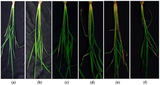 As shown in Figure 4b, there were 11 wavelengths in the visible range and 6 wavelengths in the near-infrared range. The characteristic wavelengths in the visible range were mainly due to the alteration of photosynthetic pigments; for example, 532 nm was related to xanthophyll and 696 nm was largely sensitive to variation in chlorophyll content [,]. Furthermore, the characteristic wavelengths in the near-infrared range had a close relationship with the water content and internal structure of the rice []. These were correlated with destruction caused by the SSB, further indicating that characteristic wavelengths selected by SPA were meaningful in this study.