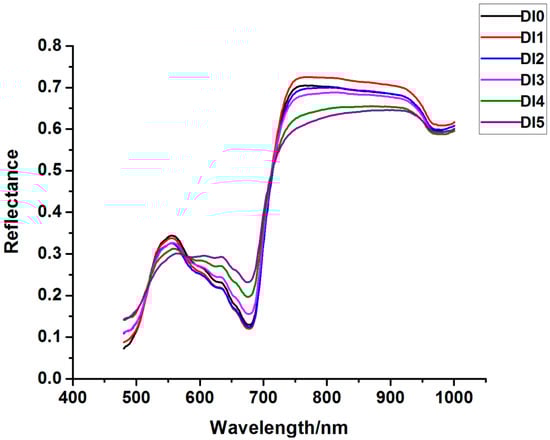 The head and end ranges of wavebands contain a large proportion of noise. Therefore, the first 82 bands and the last 22 bands were removed to improve the signal-noise ratio. Spectra in the range of 480–1000 nm were pre-processed by Savitzky–Golay smoothing before analysis. The average spectra of each degree are shown in Figure 2. It was found that the general trends of six curves were similar. Significant differences of reflectance were observed in the range of 530–700 nm and 750–940 nm. The differences between the first three degrees were smaller than the differences between the last three degrees, which could be explained by the fact that damage symptoms of the samples in the first four days were mild and the stem structures were not destroyed too seriously. In the visible range of 570–700 nm, the reflectance was higher with the increase of infestation severity. This was because of the destruction of chlorophyll located in the chloroplast of the rice stem’s cortex cell []. In the near-infrared range of 750–1000 nm, the reflectance of DI0 was higher than that of the infested samples. The more severe the sample was infested, the lower the reflectance. The reduction of reflectance with the increase of severity was mainly due to the destruction of stem structure, which led to photon scattering [].