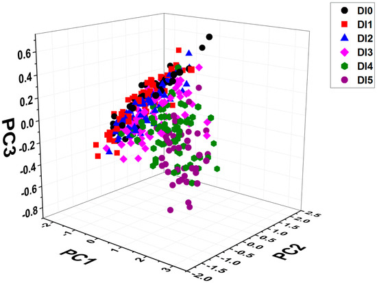 The three-dimensional scores’ scatter plot is displayed in Figure 3. In general, there was an obvious separation trend between the first four degrees and the last two degrees. The samples of the first four degrees were closely distributed while the samples of the last two degrees had a scattered distribution. The overlaps were serious between different degrees, but the samples of the first three degrees were seldom confused with the samples of the last two degrees. These phenomena indicated that the spectral characteristics would evidently change after DI3, and the chemometric method is necessary to identify accurately the degree of infestation.