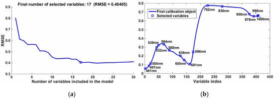 The successive projection algorithm (SPA) was employed in this study to choose the characteristic wavelengths. SPA is a common and effective method for reducing the variables of hyperspectral data, which can minimize the collinearity effects of raw input [,]. SPA is a forward variable selection method [] by optimizing the multiple linear-regression (MLR) model, which includes two phases.