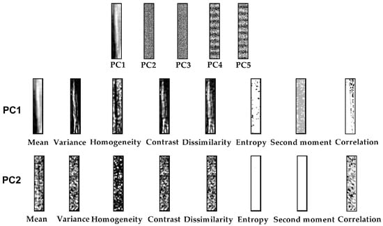 The hyperspectral image contains 512 gray-scale images according to the dimension of wavelengths, and it would be better to compress these into fewer images. Therefore, PCA was performed on the ROI hyperspectral image to extract the most informative PC images. The PC1 and PC2 images comprised a total 93.42% of the eigenvalues, and the rest of the PC images contained more noise than information, which would disturb the detection. Thus, only the PC1 and PC2 images were retained to extract the GLCM features. There were a total of 8 features for each image including mean, variance, homogeneity, contrast, dissimilarity, entropy, second moment, and correlation; thus, a new features set was formed for 16 features of each sample, as shown in Figure 5. Multiple linear-regression analysis was executed to inspect the relationship between textural features and infestation degrees. The multiple correlation coefficient R was 0.811 and the coefficient of determination R2 was 0.658, which meant the prediction was satisfactory. These demonstrated that the GLCM features contained useful information, which could be helpful for identification of SSB infestation.