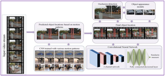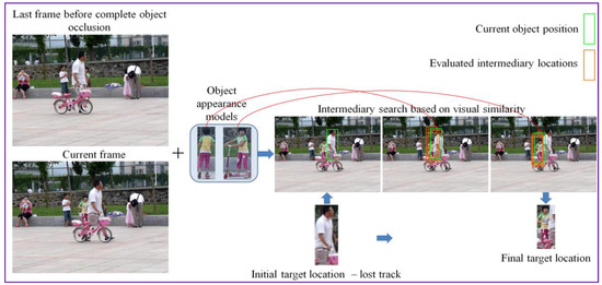 Because the proposed tracker learns generic relationships between the object’s appearance model and the motion patterns, various objects can be tracked without requiring any category-specific information about the target. The method proves to be robust when handling objects that undergo various transformations, such as deformation, translation, rotation, occlusion or light changes, and is very fast (more than 50 fps when running on Nvidia 1050Ti GPU). However, the system fails to track fast moving targets that undergo partial or complete occlusion. In addition, the approach fails to deal with multiple moving objects characterized by similar motion patterns that are situated in the same neighborhood. This phenomenon is known as tracker drift [14]. To overcome such limitations, we develop a model that integrates rich visual cues. The object’s bounding box size, position and shape are continuously updated, which makes it possible to prevent the tracker drift, notably in the case of cluttered scenes. The proposed strategy includes two major phases: (1) occlusion detection/handling; and (2) construction of an object appearance model. Let us first describe how the occlusion detection and handling is dealt with.