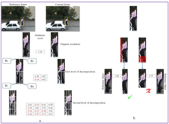 The process of occlusion detection and handling is illustrated in Figure 3. The procedure takes as input both the reference object (from the previous frame) and the candidate (in the current frame) bounding box, determined as described in the previous section. Both of them are recursively divided into a set of non-overlapping image patches with the help of a quad-tree decomposition algorithm. The process is recursively repeated until the second level of decomposition. We have chosen to use only two levels of decomposition in order to ensure a “reasonable” degree of descriptiveness for the similarity measure used consequently, which requires the availability of a sufficient number of pixels per image patch.