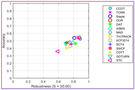 The accuracy-robustness score plot is presented in Figure 6. It can be observed that the proposed tracker shows comparable performances in terms of accuracy and robustness when compared with the winner C-COT of VOT2016 challenge.