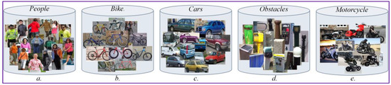 To fit the requirements of the considered VI-related application, we have extended YOLO with additional categories, specific to assistive devices for visually impaired users. The system was trained on the standard ImageNet dataset from which we retained as relevant the following object classes: vehicles; bicycles, motorcycles and pedestrians. In addition, we have constructed a set of categories relevant from the perspective of a VI people, including garbage cans, fences, pylons, edge of pavements and descending stairs. These elements have been included in a single, global category called static obstacles. The class of static obstacles can be extended with additional elements (e.g., bushes, tress, branches, etc.), depending on the user needs. However, the DEEP-SEE system cannot identify descending stairs or holes in the ground, which are difficult to distinguish when using monoscopic vision. To this purpose, the utilization of depth cameras would be more appropriate, but this issue will not be addressed in the paper. The CNN has been trained by using the same training dataset as the one presented in [16], which includes a total number of 4500 images.