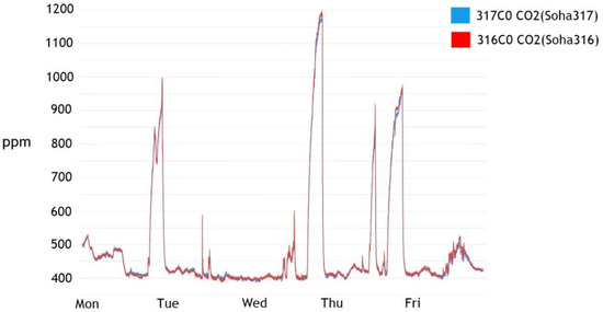 The validation of the sensors was confirmed by the concept of a “collaborative” sensor (a combination of several sensors). Figure 3 is the two sensor meters placed in one place whose CO2 measurements are shown. As we can see, all of the sensor values followed a similar trend with high measurement accuracy (the difference between the highest and lowest values is small and within the error range).
