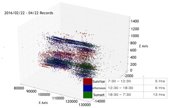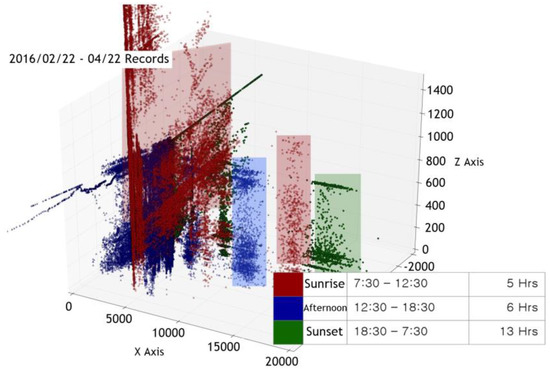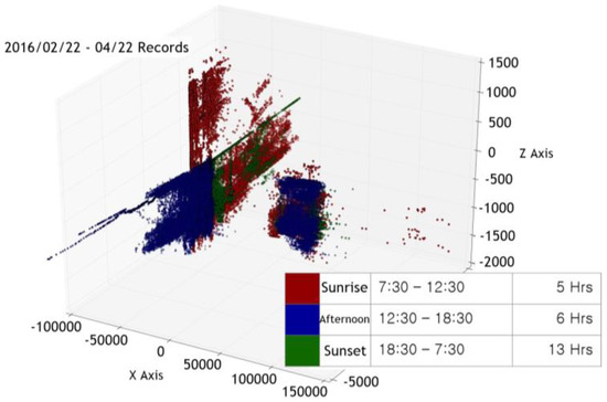 We collected sensor measurement data over about seven months at three different times of the day: sunrise (7:30 a.m. to 12:30 p.m.), afternoon (12:30 p.m. to 6:30 p.m.), and sunset (6:30 p.m. to 7:30 a.m.). The data was visualized using principal components analysis (PCA) [10]. Figure 4 is the visualization of the six measurement data collected from 22 February 2016 to 22 April 2016, into a three-dimensional space defined by PCA. We can see that the points are distributed around the position of the sun on the whole. However, the data points in some regions are either well distributed by time (clustered by different colors) or not, as we can see in Figure 5 and Figure 6. We surmise that understanding this type of data requires more advanced machine learning methods than simple linear regression models.