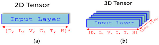 For our experiments, a sensor measurement sample was created for each time step as a two-dimensional tensor by merging the values from the sensor nodes, and arranged as a set of six air quality values. The resulting sample set is a three-dimensional tensor, which is basically a bundle of two-dimensional tensors in time intervals, as shown in Figure 7. Given that the measurement period of the experiment is one minute, it has a volume of size. When the time step of this three-dimensional tensor is set as , the time series prediction model attempts to predict the state of the vectors when time has elapsed.