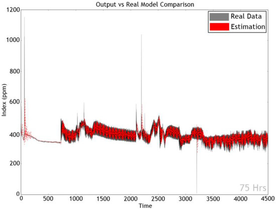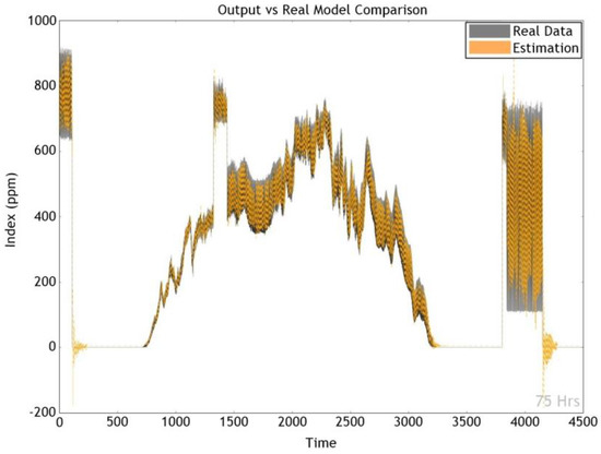 In order to verify the performance, the most accurate GRU model of experiment 13 was considered. Figure 9 and Figure 10 exhibit the actual as well as predicted values for dust and CO2 factors. As the model produced high accuracy of a 84.69%, the two graphs display very similar shapes and tendencies.
