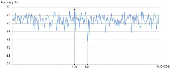 For the brute force method, all of the time-step sizes between 1 and 256 were tried in learning (Figure 11). The time-step sizes with the best learning performance was 109 (learning performance of 79.25%), and the that with the lowest learning performance was 131 (learning performance of 71.34%).