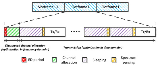 The transmission structure of each node is described in Figure 2. We consider that time is divided into fixed length slotframes, and each slotframe is composed of 100 timeslots. Each slotframe has two processes: channel allocation and transmission. In the channel allocation process, the quality of channels need be firstly measured by Energy Detections (ED) [26], because the network conditions vary over time. ED can detect energy from variable-bandwidth channels. As the variable bandwidth will suffer different degree of noise power, thus a spectrum analyzer with different low pass filters is needed to measure the noise. Then, we update the available channel set (ACS) of each node based on the rank of channel condition. The node will dynamically hop between channels according to ACS until it switches on an empty channel, and then start to send HELLO packet periodically to dwell on this channel. In the transmission process, as the node has chosen the channel, it will adjust variable timeslots of sleeping and spectrum sensing based on the residual energy to ensure the transmission rate. If the selected channel is sensed idle, a transmission starts. Otherwise, the node has to continue to sleep. The node may go through successive sleeping and spectrum sensing before data transmission.